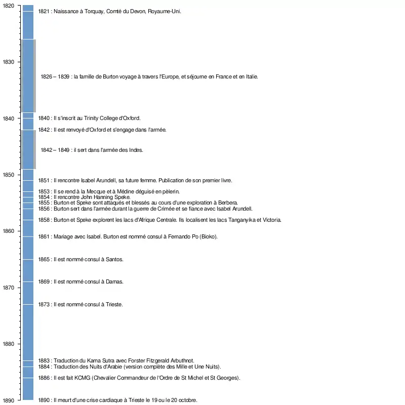 Richard Francis Burton, né le à Torquay (Angleterre) et mort le à Trieste, est un érudit et polymathe britannique. Il est tour à tour officier militaire, escrimeur, explorateur, écrivain et poète, traducteur, linguiste, orientaliste, maître soufi, ethnologue, diplomate et expérimentateur passionné de la plupart des perversions humaines.