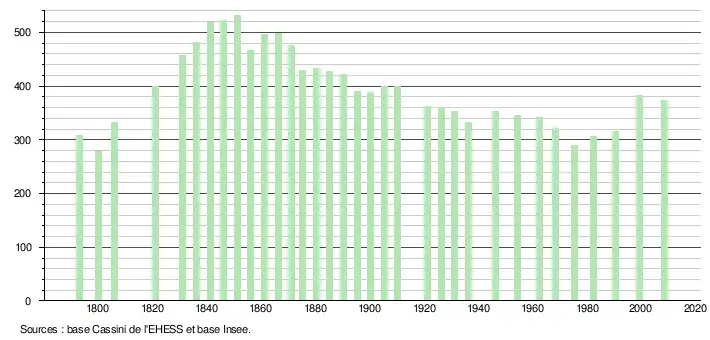 L'évolution du nombre d'habitants est connue à travers les recensements de la population effectués dans la commune depuis 1793. À partir du , les populations légales des communes sont publiées annuellement dans le cadre d'un recensement qui repose désormais sur une collecte d'information annuelle, concernant successivement tous les territoires communaux au cours d'une période de cinq ans. Pour les communes de moins de 10 000 habitants, une enquête de recensement portant sur toute la population est réalisée tous les cinq ans, les populations légales des années intermédiaires étant quant à elles estimées par interpolation ou extrapolation[3]. Pour la commune, le premier recensement exhaustif entrant dans le cadre du nouveau dispositif a été réalisé en 2008[4],[Note 1].