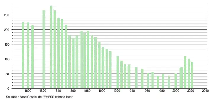 L'évolution du nombre d'habitants est connue à travers les recensements de la population effectués dans la commune depuis 1793. Pour les communes de moins de 10 000 habitants, une enquête de recensement portant sur toute la population est réalisée tous les cinq ans, les populations légales des années intermédiaires étant quant à elles estimées par interpolation ou extrapolation[16]. Pour la commune, le premier recensement exhaustif entrant dans le cadre du nouveau dispositif a été réalisé en 2007[17].