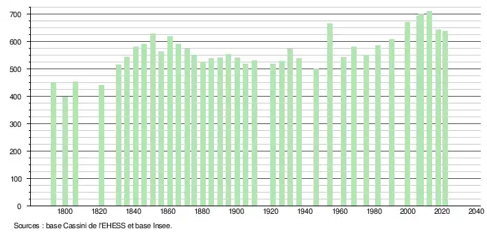 L'évolution du nombre d'habitants est connue à travers les recensements de la population effectués dans la commune depuis 1793. Pour les communes de moins de 10 000 habitants, une enquête de recensement portant sur toute la population est réalisée tous les cinq ans, les populations légales des années intermédiaires étant quant à elles estimées par interpolation ou extrapolation[16]. Pour la commune, le premier recensement exhaustif entrant dans le cadre du nouveau dispositif a été réalisé en 2007[17].