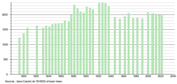 | L'évolution du nombre d'habitants est connue à travers les recensements de la population effectués dans la commune depuis 1793. Pour les communes de moins de 10 000 habitants, une enquête de recensement portant sur toute la population est réalisée tous les cinq ans, les populations légales des années intermédiaires étant quant à elles estimées par interpolation ou extrapolation[29]. Pour la commune, le premier recensement exhaustif entrant dans le cadre du nouveau dispositif a été réalisé en 2007[30]. En 2021, la commune comptait 1 975 habitants[Note 4], en diminution de 1,25 % par rapport à 2015 (Aude : +2,47 %, France hors Mayotte : +1,84 %). |