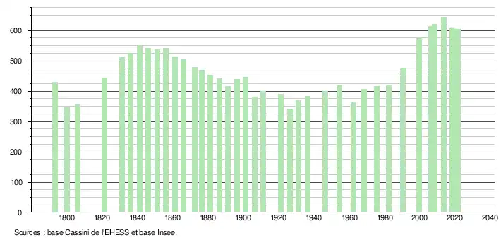 L'évolution du nombre d'habitants est connue à travers les recensements de la population effectués dans la commune depuis 1793. Pour les communes de moins de 10 000 habitants, une enquête de recensement portant sur toute la population est réalisée tous les cinq ans, les populations légales des années intermédiaires étant quant à elles estimées par interpolation ou extrapolation[32]. Pour la commune, le premier recensement exhaustif entrant dans le cadre du nouveau dispositif a été réalisé en 2008[33].