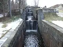- pour les canaux latéraux, aux rivières qu'elles suivent ; dans ces cas, on cherche la jonction la plus facile et la plus courte à construire pour une alimentation facile à contrôler (un canal doit éviter de subir les effets, parfois dévastateurs, des crues - et, dans les pays nordiques, des débâcles printanières -, alors qu'une rivière ne peut guère y échapper.) Exemple : sur quelque 120 m à 160 de l'écluse 8, là où le canal de Chambly se trouve en surélévation par rapport à la Rivière Richelieu jusqu'au Bassin de Chambly ;