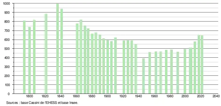 L'évolution du nombre d'habitants est connue à travers les recensements de la population effectués dans la commune depuis 1793. Pour les communes de moins de 10 000 habitants, une enquête de recensement portant sur toute la population est réalisée tous les cinq ans, les populations légales des années intermédiaires étant quant à elles estimées par interpolation ou extrapolation[26]. Pour la commune, le premier recensement exhaustif entrant dans le cadre du nouveau dispositif a été réalisé en 2007[27].