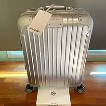 Les premières valises à rainures emblématiques de la marque Rimowa ont été produites en 1937. Du fait de leur composition à base d’un alliage d’aluminium et de magnésium utilisé dans la construction automobile et aéronautique[32], elles sont à la fois légères[33] et résistantes[34]. Au départ développée pour des raisons techniques, la structure en aluminium à rainures parallèles servait à stabiliser la valise, mais rapidement, ces stries, au design protégé, sont devenues la signature de la marque[35].