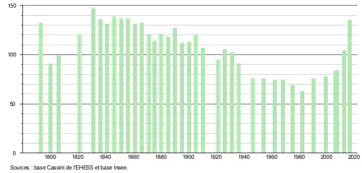 L'évolution du nombre d'habitants est connue à travers les recensements de la population effectués dans la commune depuis 1793. Pour les communes de moins de 10 000 habitants, une enquête de recensement portant sur toute la population est réalisée tous les cinq ans, les populations légales des années intermédiaires étant quant à elles estimées par interpolation ou extrapolation[7]. Pour la commune, le premier recensement exhaustif entrant dans le cadre du nouveau dispositif a été réalisé en 2007[8].