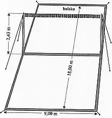 Le terrain a une forme rectangulaire de 18 mètres de longueur sur 9 mètres de largeur pour les équipes de 2 et 3 joueurs. Le filet qui n'est rien d'autre qu'une ficelle ou une bande d'épaisseur de 1 cm au moins avec des rubans de couleurs de 25 cm de longueur minimale, est suspendu à une hauteur de 243 cm. Les dimensions du terrain et la hauteur du filet varient pour les différentes catégories d'âge, ainsi que pour les jeux individuels.