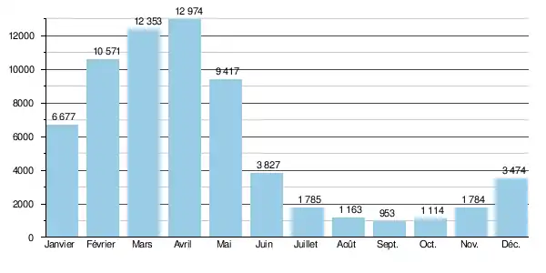 Sur la durée d'observation de 18 ans, le débit minimum mensuel observé a été de 519 m3/s (en septembre), tandis que le débit maximal mensuel enregistré se montait à 21 102 m3/s (en mars).