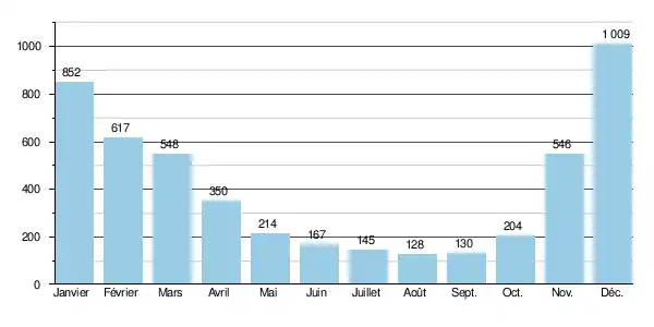 Sur la durée d'observation de 36 ans, le débit minimum observé a été de 38 m3/s, tandis que le débit maximal se montait à 2 896 m3/s.