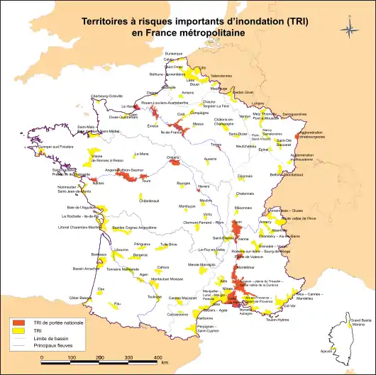Leur élaboration a été une priorité des services de l’État au début des années 2000. Ils ne couvrent pas tout le territoire et ont été élaborés par les directions départementales des territoires (DDT). Ils cartographient généralement au 1/25 000e les phénomènes d’inondation à partir de connaissances historiques, de l’étude du fonctionnement naturel des cours d’eau, de l’analyse de la topographie, et parfois de modélisations[41]. Ils sont rattachés au volet « gestion des risques » des SDAGE élaborés par les comités de bassin[42].
