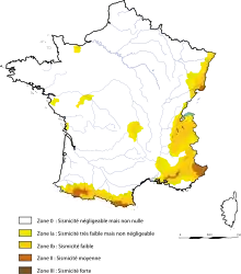 | Zone 0 | Sismicité négligeable | Aucune secousse d'intensité au moins égale à VIII n'y a été observée historiquement ; les règles parasismiques ne sont pas obligatoires. |