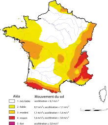 Plusieurs cartes d’iso-accélération correspondant à différents niveaux de probabilités annuelles ont été établies. Concernant les ouvrages à risque normal, à savoir, selon le décret du , « les bâtiments, les équipements et les installations pour lesquels les effets sur les personnes, les biens et l'environnement de dommages même mineurs résultant d'un séisme sont circonscrits à leurs occupants et à leur voisinage immédiat »[22], l'ensemble des probabilités d’occurrences de l’événement sismique est de 10 % d’ici 50 ans. L’événement sismique de référence est traduit en termes d’accélération du sol, variable de 0,4 m/s2 à 1,6 m/s2 en métropole, et atteignant 3 m/s2 anx Antilles. C’est cette accélération nominale qui est prise en compte pour l’application des règles de constructions parasismiques.