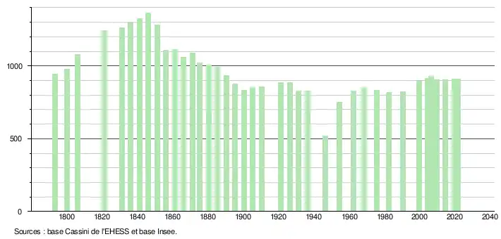 L'évolution du nombre d'habitants est connue à travers les recensements de la population effectués dans la commune depuis 1793. Pour les communes de moins de 10 000 habitants, une enquête de recensement portant sur toute la population est réalisée tous les cinq ans, les populations légales des années intermédiaires étant quant à elles estimées par interpolation ou extrapolation[16]. Pour la commune, le premier recensement exhaustif entrant dans le cadre du nouveau dispositif a été réalisé en 2004[17].