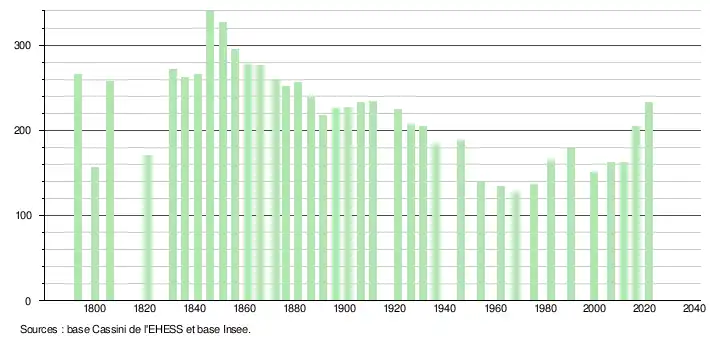 L'évolution du nombre d'habitants est connue à travers les recensements de la population effectués dans la commune depuis 1793. Pour les communes de moins de 10 000 habitants, une enquête de recensement portant sur toute la population est réalisée tous les cinq ans, les populations légales des années intermédiaires étant quant à elles estimées par interpolation ou extrapolation[41]. Pour la commune, le premier recensement exhaustif entrant dans le cadre du nouveau dispositif a été réalisé en 2006[42].