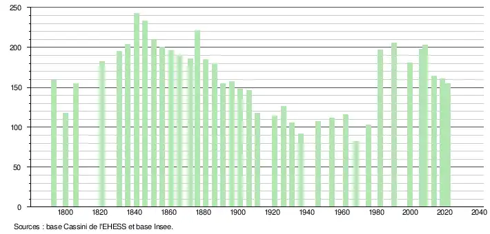 L'évolution du nombre d'habitants est connue à travers les recensements de la population effectués dans la commune depuis 1793. Pour les communes de moins de 10 000 habitants, une enquête de recensement portant sur toute la population est réalisée tous les cinq ans, les populations légales des années intermédiaires étant quant à elles estimées par interpolation ou extrapolation[15]. Pour la commune, le premier recensement exhaustif entrant dans le cadre du nouveau dispositif a été réalisé en 2008[16].