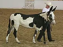 Les robes tachetées chez l'âne résultent de mutations du gène KIT[4],[8]. Il semble que cette mutation soit létale à l'état homozygote, tous les ânes tachetés testés étant hétérozygotes[9]. Une mutation a été identifiée à partir de l'étude de quatre ânes tachetés, tous hétérozygotes[8]. L'extension des marquages blancs peut être très variable, depuis une liste en tête dans ses formes minimales[9]. Chez l'âne miniature, il existe une forme avec marques blanches au bas des membres et une étoile en tête[9].
