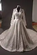 L’annonce formelle de la robe et de son créateur n’a eu lieu qu’à la descente de la mariée pour son entrée dans l’abbaye de Westminster avant la cérémonie[2]. Remarquée pour son design, son symbolisme et l’influence pressentie sur la tendance occidentale en robe de mariée, la robe était très attendue et a été largement commentée dans les médias. Des répliques de la robe ont été produites et vendues, et l’originale est exposée au palais de Buckingham[3].