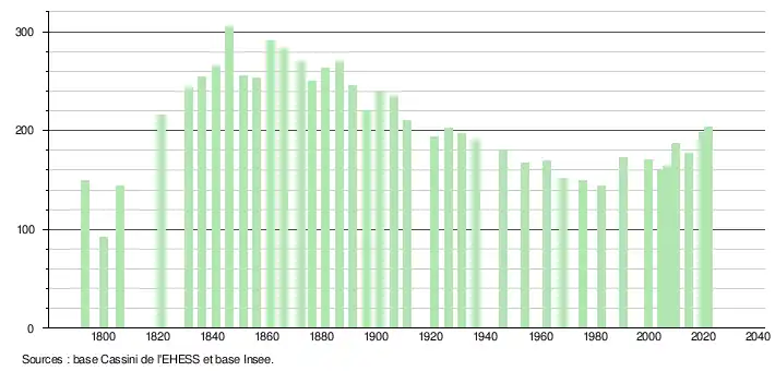 L'évolution du nombre d'habitants est connue à travers les recensements de la population effectués dans la commune depuis 1793. Pour les communes de moins de 10 000 habitants, une enquête de recensement portant sur toute la population est réalisée tous les cinq ans, les populations légales des années intermédiaires étant quant à elles estimées par interpolation ou extrapolation[26]. Pour la commune, le premier recensement exhaustif entrant dans le cadre du nouveau dispositif a été réalisé en 2004[27].