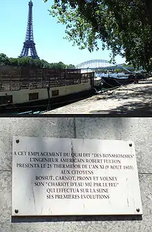 Le , Robert Fulton fait fonctionner le premier bateau à vapeur, sur la Seine, en présence de plusieurs membres de l’Institut : Volney, Prony, Bossut Carnot et de François-André Michaux[14]. Pendant le premier voyage de ce prototype, un seul passager osa accompagner Fulton, le français Andrieux, qui écrivit que, pendant le voyage, Fulton lui fit part des difficultés qu’il avait trouvées en France, et rejetait sur le ministre de la Marine Decrès, ennemi de toute innovation, particulièrement opposé aux idées de Fulton, la responsabilité de l’échec qu’il avait éprouvé auprès du gouvernement français[15]. Fulton prit son parti de ce refus, car c’était pour son pays qu’il avait travaillé et cherché au début de ses travaux. Ayant d’abord songé à offrir son invention aux États-Unis, il s’occupa donc de prendre les dispositions nécessaires pour faire adopter par son pays le système de transports, dont l’expérience venait de lui démontrer toute la valeur, en écrivant aux membres du Congrès de l’État de New York pour faire connaitre les résultats qui venaient d’être obtenus à Paris[15]. Le Congrès dressa alors un acte public, aux termes duquel le privilège exclusif de naviguer sur toutes les eaux de cet État, au moyen de la vapeur, concédé à Livingston, par le traité de 1797, était prolongé, en faveur de Livingston et Fulton, pour un espace de vingt ans, à partir de l’année 1803. On imposait seulement aux associés la condition de produire, dans l’espace de deux ans, un bateau à vapeur faisant quatre milles[note 1] à l’heure (~6,5 km/h), contre le courant ordinaire de l’Hudson[15]. Dès la réception de cet acte, Livingston écrivit en Angleterre, à Boulton et Watt, pour commander une machine à vapeur, dont il donna les plans et la dimension, sans spécifier à quel objet il la destinait. On s’occupa aussitôt de construire cette machine dans les ateliers de Soho, et Fulton, qui peu de temps après, se rendit en Angleterre, put en surveiller l’exécution[15].
