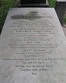- La pierre tombale de Robert Morrison dans le ancien cimetière protestant de Macao (en) porte un long poème biographique en anglais, et une stèle comportant une biographie en chinois a été érigée à côté de sa tombe en 1934 par l'Association de l'Église chrétienne chinoise de Guangdong à l'occasion du centième anniversaire de sa mort[35]. Sur le terrain du cimetière se trouve une chapelle protestante (en) érigée vers 1833 et reconstruite en 1921, dénommée la "chapelle Morrison" (Morrison Chapel).