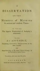 - (en) Robert Wallace, Dissertation on the numbers of mankind in antient and modern times, Édinbourg, Gavin Hamilton et John Balfour, (lire en ligne)