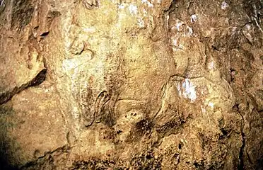 La frise sculptée in situ est découverte dès 1950. Elle est composée de bisons, de chevaux, de bouquetins, de félins, de corps de femmes, sans tête ni pieds, appelées Vénus, de visages humains.