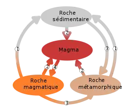- les roches magmatiques (ou ignées), formées par la solidification de magmas ou de laves :