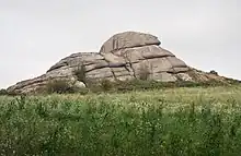Au premier plan : arène, roche meuble (sable grossier plus ou moins enrobé d'argile) résultant d'une altération plus poussée.