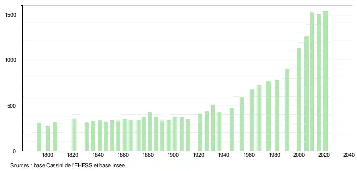 L'évolution du nombre d'habitants est connue à travers les recensements de la population effectués dans la commune depuis 1793. Pour les communes de moins de 10 000 habitants, une enquête de recensement portant sur toute la population est réalisée tous les cinq ans, les populations légales des années intermédiaires étant quant à elles estimées par interpolation ou extrapolation[22]. Pour la commune, le premier recensement exhaustif entrant dans le cadre du nouveau dispositif a été réalisé en 2005[23].