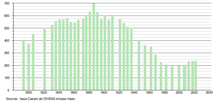 L'évolution du nombre d'habitants est connue à travers les recensements de la population effectués dans la commune depuis 1793. Pour les communes de moins de 10 000 habitants, une enquête de recensement portant sur toute la population est réalisée tous les cinq ans, les populations légales des années intermédiaires étant quant à elles estimées par interpolation ou extrapolation[24]. Pour la commune, le premier recensement exhaustif entrant dans le cadre du nouveau dispositif a été réalisé en 2007[25].