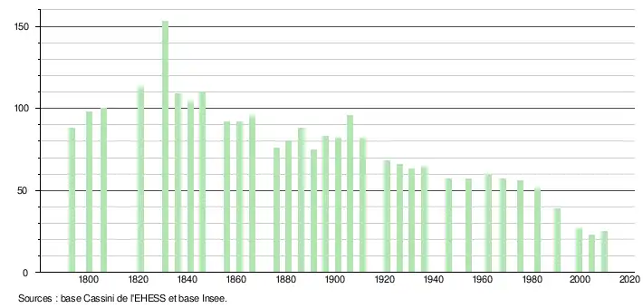 L'évolution du nombre d'habitants est connue à travers les recensements de la population effectués dans la commune depuis 1793. À partir du , les populations légales des communes sont publiées annuellement dans le cadre d'un recensement qui repose désormais sur une collecte d'information annuelle, concernant successivement tous les territoires communaux au cours d'une période de cinq ans. Pour les communes de moins de 10 000 habitants, une enquête de recensement portant sur toute la population est réalisée tous les cinq ans, les populations légales des années intermédiaires étant quant à elles estimées par interpolation ou extrapolation[2]. Pour la commune, le premier recensement exhaustif entrant dans le cadre du nouveau dispositif a été réalisé en 2004[3],[Note 1].
