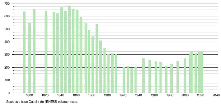 L'évolution du nombre d'habitants est connue à travers les recensements de la population effectués dans la commune depuis 1793. Pour les communes de moins de 10 000 habitants, une enquête de recensement portant sur toute la population est réalisée tous les cinq ans, les populations légales des années intermédiaires étant quant à elles estimées par interpolation ou extrapolation[18]. Pour la commune, le premier recensement exhaustif entrant dans le cadre du nouveau dispositif a été réalisé en 2008[19].