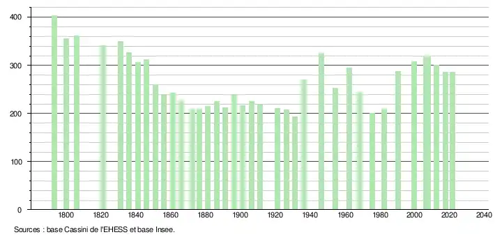L'évolution du nombre d'habitants est connue à travers les recensements de la population effectués dans la commune depuis 1793. Pour les communes de moins de 10 000 habitants, une enquête de recensement portant sur toute la population est réalisée tous les cinq ans, les populations légales des années intermédiaires étant quant à elles estimées par interpolation ou extrapolation[23]. Pour la commune, le premier recensement exhaustif entrant dans le cadre du nouveau dispositif a été réalisé en 2007[24].