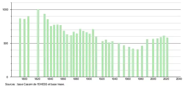 L'évolution du nombre d'habitants est connue à travers les recensements de la population effectués dans la commune depuis 1793. Pour les communes de moins de 10 000 habitants, une enquête de recensement portant sur toute la population est réalisée tous les cinq ans, les populations légales des années intermédiaires étant quant à elles estimées par interpolation ou extrapolation[12]. Pour la commune, le premier recensement exhaustif entrant dans le cadre du nouveau dispositif a été réalisé en 2006[13].