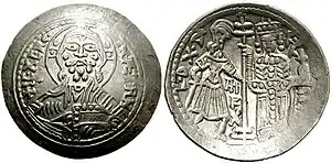 Roger II de Sicile, détail de la mosaïque « Roger couronné roi par le Christ », église de la Martorana, Palerme. | |