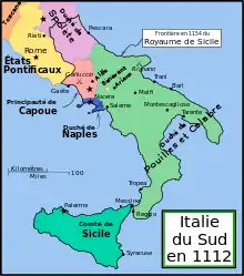 En juin 1127, Guillaume, duc d'Apulie, meurt sans laisser d'enfant. Roger II en profite pour réclamer la succession du duché. Mais le pape Honorius II s'oppose à l'union du comté de Sicile au duché d'Apulie. En , le pape prêche la croisade et monte Robert II d'Aversa et Rainolf d'Alife, le beau-frère de Roger, contre lui. La coalition échoue cependant et en août 1128, Honorius se voit contraint de conférer à Roger II le titre de duc d'Apulie à Bénévent[10]. Après s'être emparé de Malte en 1127[11], Roger II lance une campagne de pacification qui met fin à la résistance des barons. En septembre 1129 à Melfi, une assemblée d'évêques et de barons prête serment de fidélité au duc et à ses fils, Roger et Tancrède, et reconnaît la souveraineté du Normand sur l'ensemble de l'Apulie. Le duc interdit les guerres privées, ordonne aux barons de soumettre les criminels à la justice ducale, et exige que l'on respecte les biens des marchands, des pèlerins et des voyageurs[12].