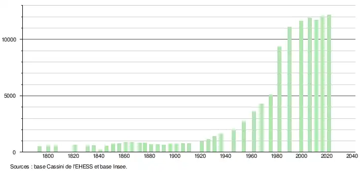 L'évolution du nombre d'habitants est connue à travers les recensements de la population effectués dans la commune depuis 1793. Pour les communes de plus de 10 000 habitants les recensements ont lieu chaque année à la suite d'une enquête par sondage auprès d'un échantillon d'adresses représentant 8 % de leurs logements, contrairement aux autres communes qui ont un recensement réel tous les cinq ans[26],[Note 4].