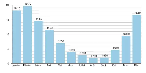 La rivière présente des fluctuations saisonnières de débit, avec des crues d'hiver portant le débit mensuel moyen entre 14,5 et 19,7 m3/s, de décembre à mars inclus (maximum en janvier-février), et des basses eaux d'été, sur une période allant de juillet à septembre, avec une baisse du débit moyen mensuel allant jusqu'au plancher de 1,78 m3/s au mois d'août.