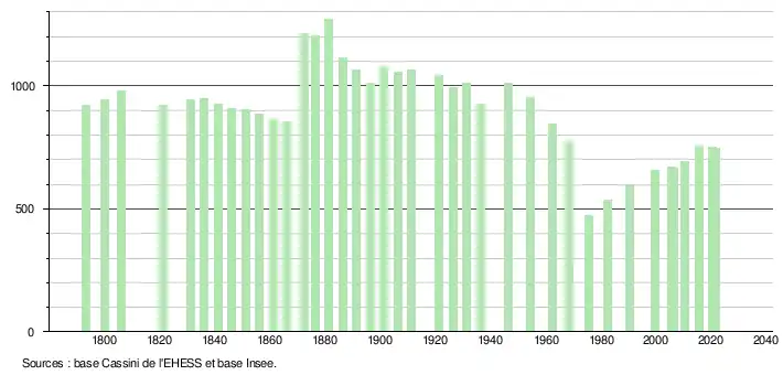 L'évolution du nombre d'habitants est connue à travers les recensements de la population effectués dans la commune depuis 1793. Pour les communes de moins de 10 000 habitants, une enquête de recensement portant sur toute la population est réalisée tous les cinq ans, les populations légales des années intermédiaires étant quant à elles estimées par interpolation ou extrapolation[29]. Pour la commune, le premier recensement exhaustif entrant dans le cadre du nouveau dispositif a été réalisé en 2005[30].