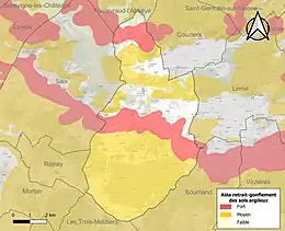 Les mouvements de terrains susceptibles de se produire sur la commune sont des affaissements et effondrements liés aux cavités souterraines (hors mines) et des tassements différentiels[21]. Afin de mieux appréhender le risque d’affaissement de terrain, un inventaire national permet de localiser les éventuelles cavités souterraines sur la commune[22]. Le retrait-gonflement des sols argileux est susceptible d'engendrer des dommages importants aux bâtiments en cas d’alternance de périodes de sécheresse et de pluie[23]. 80,3 % de la superficie communale est en aléa moyen ou fort (79,5 % au niveau départemental et 48,5 % au niveau national)[Carte 2]. Depuis le , en application de la loi ÉLAN, différentes contraintes s'imposent aux vendeurs, maîtres d'ouvrages ou constructeurs de biens situés dans une zone classée en aléa moyen ou fort[Note 4],[24].