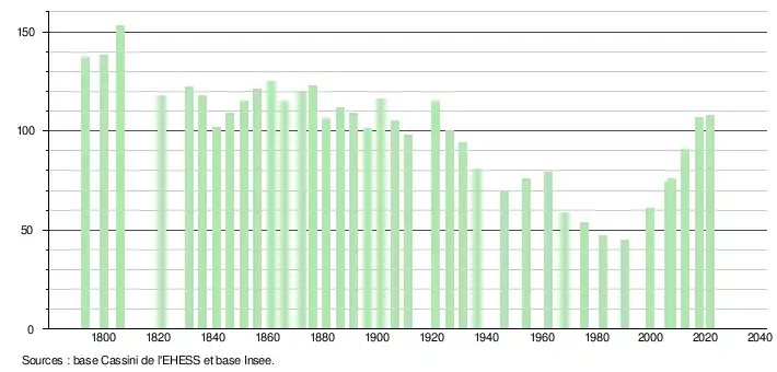 L'évolution du nombre d'habitants est connue à travers les recensements de la population effectués dans la commune depuis 1793. Pour les communes de moins de 10 000 habitants, une enquête de recensement portant sur toute la population est réalisée tous les cinq ans, les populations légales des années intermédiaires étant quant à elles estimées par interpolation ou extrapolation[46]. Pour la commune, le premier recensement exhaustif entrant dans le cadre du nouveau dispositif a été réalisé en 2007[47].