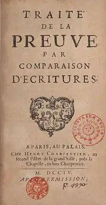 - Traité de la preuve par comparaison d'écritures. Paris : H. Charpentier, 1704. 12°, 152 p. (Paris BNF), consultable sur Gallica.