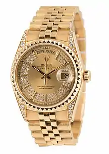 La Rolex Oyster Perpetual Day-Date est un COSC certifié, remontage automatique chronomètres fabriqué par Rolex. Présentée à l'origine en 1956, la Day-Date a été la première montre à afficher la date et le jour[1]. La Day-Date est l'un des modèles Rolex fabriqués uniquement en or jaune massif 18 carats, en or blanc 18 carats, or everose 18 carats (version Rolex en or rose 18 carats) et en platine (PT950)[2].