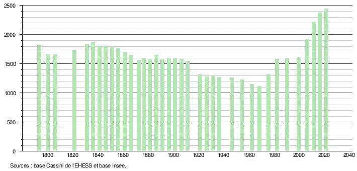L'évolution du nombre d'habitants est connue à travers les recensements de la population effectués dans la commune depuis 1793. Pour les communes de moins de 10 000 habitants, une enquête de recensement portant sur toute la population est réalisée tous les cinq ans, les populations légales des années intermédiaires étant quant à elles estimées par interpolation ou extrapolation[30]. Pour la commune, le premier recensement exhaustif entrant dans le cadre du nouveau dispositif a été réalisé en 2006[31].