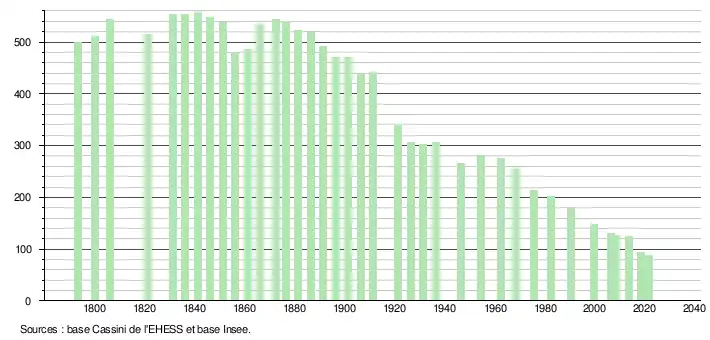 L'évolution du nombre d'habitants est connue à travers les recensements de la population effectués dans la commune depuis 1793. Pour les communes de moins de 10 000 habitants, une enquête de recensement portant sur toute la population est réalisée tous les cinq ans, les populations légales des années intermédiaires étant quant à elles estimées par interpolation ou extrapolation[14]. Pour la commune, le premier recensement exhaustif entrant dans le cadre du nouveau dispositif a été réalisé en 2008[15].