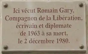 Le nom de Romain Gary a été donné en 2006 à la place Romain-Gary dans le 15e arrondissement de Paris et à la bibliothèque patrimoniale de Nice. L'Institut français de Jérusalem porte également le nom de Romain Gary.