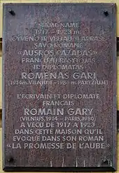 Romain Gary, né Roman Kacew le à Vilna (Empire russe) et mort le à Paris, est un écrivain français d'origine russe et de confession juive, de langues française et anglaise. Homme aux multiples activités, il a été successivement aviateur et résistant (fait compagnon de la Libération), romancier, diplomate, scénariste et réalisateur.