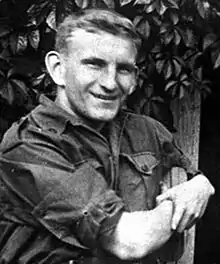 Simon Wiesenthal, ici en 1973, alors architecte de trente deux ans, arrêté le [40] par des hommes de Nachtigall[36], sauvé in extremis par l'un d'eux, ancien collègue[40], du peloton d'exécution au moment où l'angélus de midi sonne la pause.