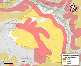 Les mouvements de terrains susceptibles de se produire sur la commune sont des tassements différentiels[17]. Le retrait-gonflement des sols argileux est susceptible d'engendrer des dommages importants aux bâtiments en cas d’alternance de périodes de sécheresse et de pluie[18]. 84,7 % de la superficie communale est en aléa moyen ou fort (54,9 % au niveau départemental et 48,5 % au niveau national)[Carte 2]. Depuis le , en application de la loi ELAN, différentes contraintes s'imposent aux vendeurs, maîtres d'ouvrages ou constructeurs de biens situés dans une zone classée en aléa moyen ou fort[Note 3],[19].