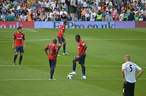 Le , Lukaku s'engage pour cinq saisons avec l'Everton FC[35] pour 35 millions d'euros, un record dans l'histoire d'Everton[36]. Le , il marque son premier triplé sous le maillot d'Everton lors du seizième de finale aller de Ligue Europa face aux Young Boys Berne (1-4)[37]. Lors du match retour à Goodison Park, il inscrit un doublé, marquant ainsi cinq buts en deux confrontations. Lukaku termine co-meilleur buteur de la C3 avec huit réalisations, et ce, malgré l'élimination des Toffees dès les huitièmes de finale.
